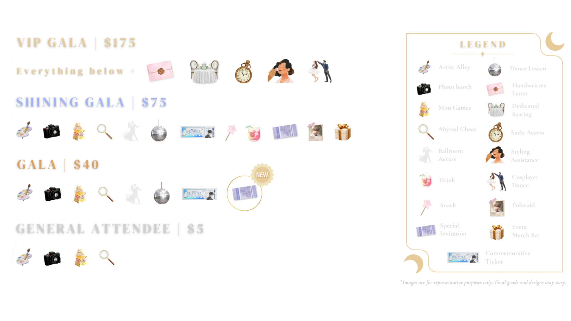 Limited to Gala Ticket holders, Starlit Memories is our Love and Deepspace themed Fantasy Gala.The Gala Ballroom will be open from 7 - 11 PM.